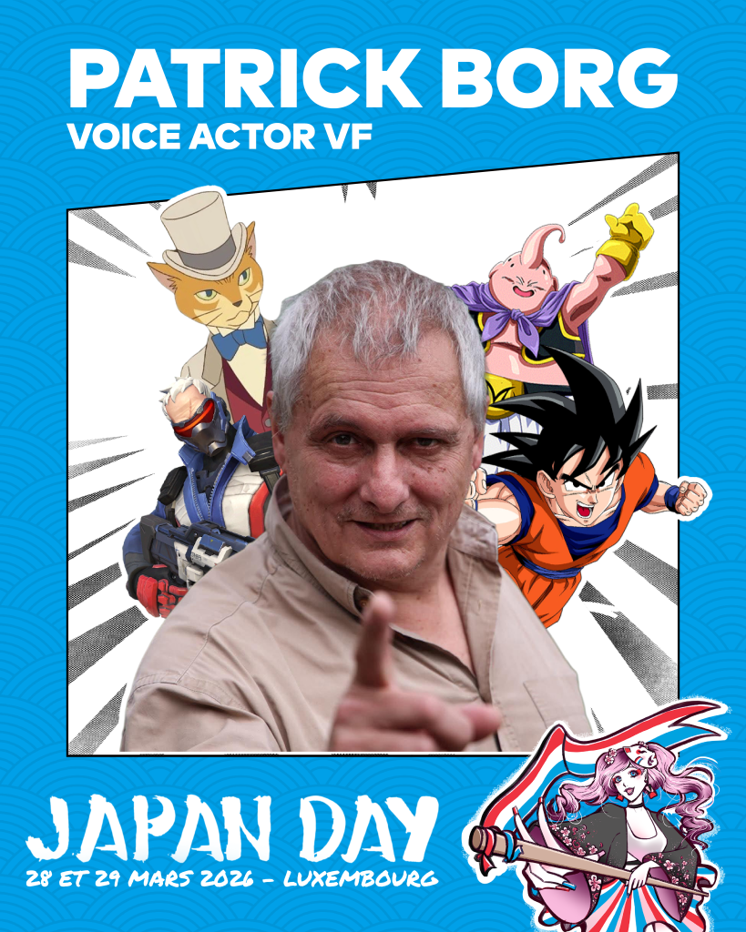 Patrick Borg Comédien de doublage français SAMEDI 28 MARS & DIMANCHE 29 MARS La Japan Day Luxembourg a l’honneur d’accueillir Patrick Borg, voix légendaire du doublage français !Il a prêté sa voix à de nombreux personnages cultes, dont :– Roland (Ranma ½)– Mick Zaford (Borderlands 2)– Caraf (Astérix et les Vikings)– Angel (David Boreanaz – […]